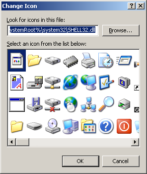 «Стандартное» диалоговое окно выбора иконки, основанное на использовании функции PickIconDlg(), которая не была документирована до версии 5.0 DLL-библиотеки shell32.dll (под Windows 95/98/Me/NT4 функция импортируется по порядковому номеру #62).