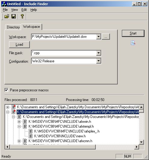 К приятным возможностям стоит отнести поиск по маске в пределах «рабочего пространства», разбор макросов препроцессора и возможность экспорта получившегося дерева включений в XML.