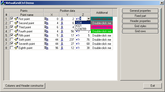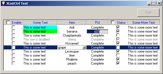 «Очень простой», со слов автора, грид, порожденный от класса CWnd. Заголовок является отдельным логическим объектом; «нефиксированная» часть таблицы, предназначенная для отображения собственно данных, может работать только в так называемом «виртуальном режиме» — задача хранения данных целиком возлагается на приложение. Выглядит довольно симпатично: