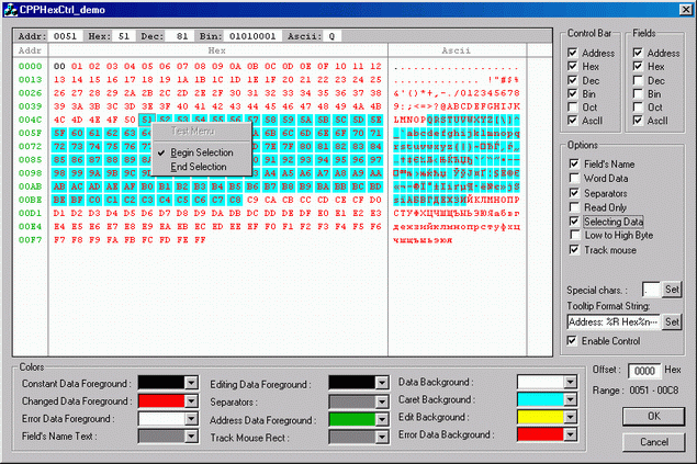 Данный элемент управления предназначен для просмотра и редактирования файлов в шестнадцатеричном, десятичном, двоичном, восьмеричном виде (также поддерживается и ASCII):