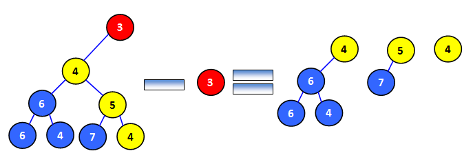 При удалении минимального элемента кучи сначала необходимо найти пирамидальное дерево, корнем которого он является, и исключить это дерево из общего списка деревьев биномиальной кучи. После чего необходимо разбить исходное дерево на log2(count) пирамидальных деревьев (где count – количество элементов дерева), которые являются поддеревьями исходного дерева (рис. 7). Эти деревья будут иметь размеры, равные степени двойки, а также будут попарно различны. Это обстоятельство дает право объединить эти деревья в отдельную биномиальную кучу T. После чего остается только объединить исходную биномиальную кучу с кучей T.