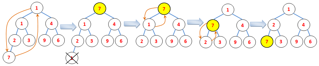 Рисунок 4. Процесс удаление минимального элемента из бинарной кучи.