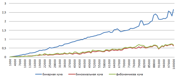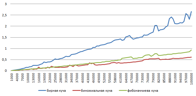 Из таблицы 2 можно сделать вывод, что фибоначчиева куча представляет наиболее выгодный вариант для реализации приоритетной очереди. Но в ходе проведенных тестов было выявлено, что все логарифмические операции в фибоначчиевой куче имеют очень большую константу в оценке асимптотической сложности. Тем не менее, только эта куча позволяет объединять две кучи в одну за константное время.