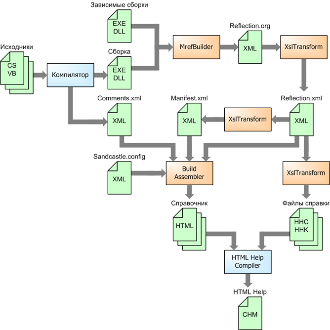Вы пишете свой код (на C#, VB.NET или другом языке), используя или не используя документирующие XML-комментарии. В результате компиляции получается сборка и (опционально) сопутствующий ей XML-файл с информацией из XML-комментариев. Либо, у вас есть сторонняя сборка, к которой может быть приложен XML-файл. В любом случае, задача состоит в получении справочника по этой сборке.