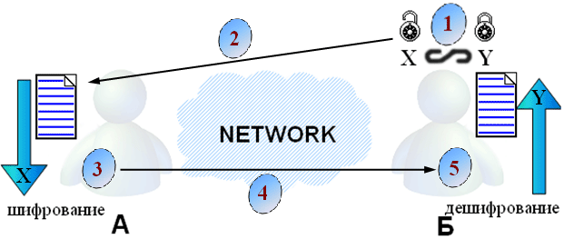 Получив от актора Б открытый ключ, актор А шифрует сообщение с его помощью, после чего отправляет уже готовую криптограмму актору Б. Наконец, актор Б успешно получает криптотекст и дешифрует его своим, никому не известным, секретным ключом.
