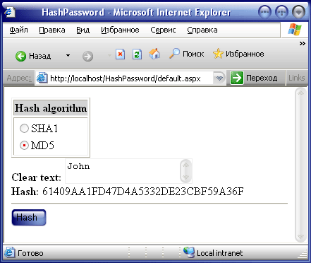 Можете смело запускать приложение и вводить имя пользователя и пароль. Если была введена верная пара, то вы получите приветствие, в противном случае – сообщение о неверных данных. При этом все данные хранятся в файле Web.config, но уже не в открытом виде, а в хэшированном.