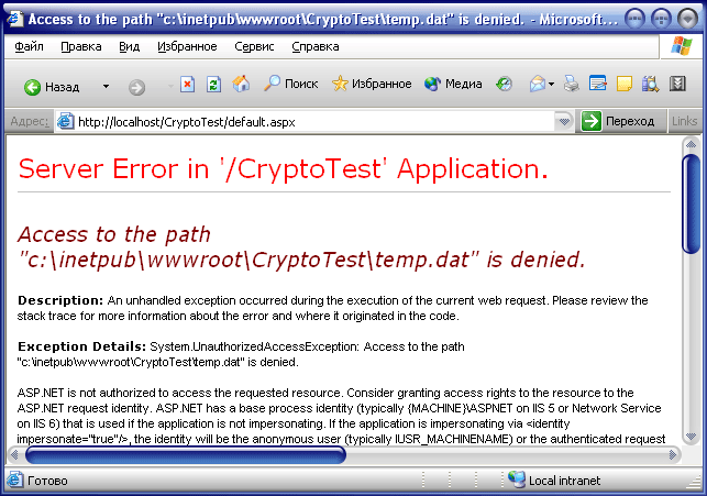 Во время выполнения приложения вы можете столкнуться с сообщением, показанным на рисунке 2. Это сообщение говорит, что создание файла temp.dat запрещено. Такое происходит, если пользователя ASPNET нет в списке ACL к папке Web-приложения.