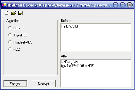 В листинге 1.2 все основные действия происходят в обработчике события нажатия кнопки btnEncrypt. Давайте рассмотрим его подробнее. Вначале создаётся экземпляр провайдера шифрования. Для каждого криптометода существует свой провайдер, например, DESCryptoServiceProvider, RSACryptoServiceProvider, RijndealManaged и др. Их имена объявлены в следующих форматах: <ИмяКриптометода>CryptoServiceProvider или <ИмяКриптометода>Managed. После инициализации криптопровайдера создаётся переменная, реализующая интерфейс-шифратор; далее открывается поток для записи данных в файл. После этого инициализируется криптопоток, в аргументах которого задаётся конечный поток данных (в нашем случае – это файловый поток fs); способ криптографической трансформации, т. е. интерфейс-шифратор, и действие, которое необходимо выполнить с данными. Из возможных действий выделяются чтение и запись.