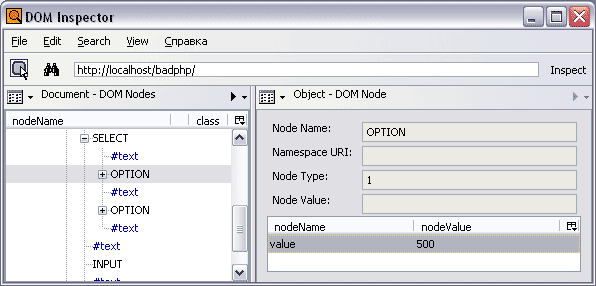 Кажется, скрипт хорошо защищен от внешнего воздействия, потому что пользователь «не может» исправить данные. Но в меню «Инструменты» есть такая вещь – DOM Inspector. Открываем его (рисунок 2).