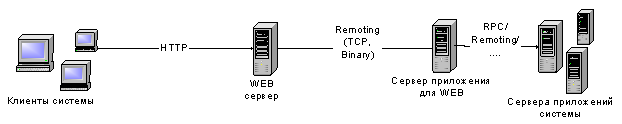 Интересующий нас участок цепи: Web-сервер – сервер приложений для Web. Мной выбран протокол взаимодействия .NET Remoting через TCP с бинарной сериализацией по причине высокой эффективности этого сочетания по сравнению с HTTP вместе с SOAP.