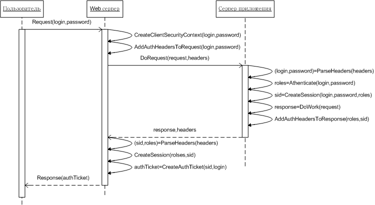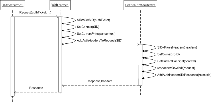 Теперь пользователь аутентифицирован на стороне Web-сервера и может выполнять программы, реализующие логику Web-приложения. В процессе выполнения этих программ Web-сервер может обращаться к серверу приложений. Естественно, что и там запрос пользователя необходимо аутентифицировать. Для этого на сервер приложений передается SID, который извлечен из билета аутентификации Web-сервером. По SID происходит аутентификация и восстанавливается пользовательская сессия на сервере приложений.