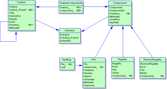 Из представленной схемы, на которой для упрощения картины представлены лишь основные таблицы, видно, что приложение (product в терминологии Microsoft) состоит из опций (таблица Feature), имеющих иерархическую структуру, которые, в свою очередь, делятся на компоненты (таблица Component).