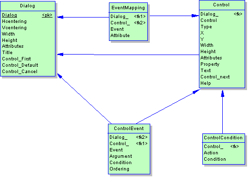 Интерфейс состоит из последовательности модальных диалогов (таблица Dialog), на которых расположены элементы управления (таблица Control). С каждым из элементов может быть ассоциировано одно или несколько событий (таблица ControlEvent), которые могут менять свои состояния (таблица ControlCondition) и взаимодействовать с другими элементами через подписку на их события (таблица EventMapping).
