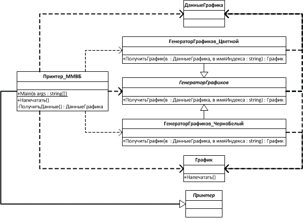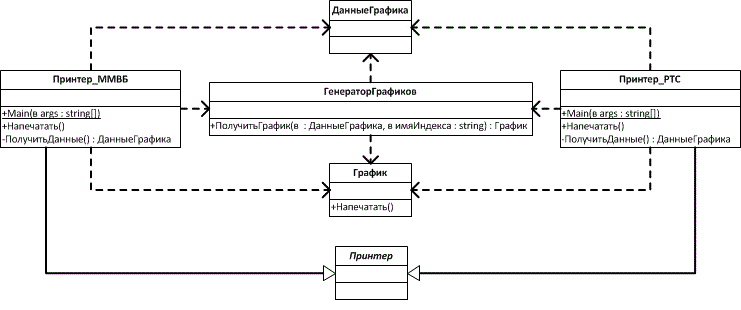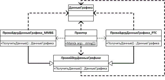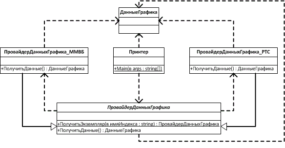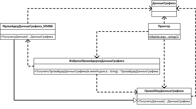 У данной реализации есть следующее преимущество по сравнению с реализацией архитектуры, изображенной на рисунке 4. Предположим, система реализована по диаграмме рисунка 4, и нам понадобилось создать систему для статистической обработки данных изменения биржевых индексов. Предположим, в этой системе будет компонент ОбработчикДанныхГрафика. Этот компонент получает данные изменения биржевого индекса у компонента ПровайдерДанныхГрафика_ММВБ или ПровайдерДанныхГрафика_РТС, то есть становится зависимым от этих компонентов. Но компоненты ПровайдерДанныхГрафика_ММВБ или ПровайдерДанныхГрафика_РТС уже зависят от компонента Принтер. Таким образом, компоненты ПровайдерДанныхГрафика_ММВБ и ПровайдерДанныхГрафика_РТС становятся разделяемымыми, что увеличивает связанность. Если мы будем использовать паттерн «Factory Method», то компоненты ОбработчикДанныхГрафика и Принтер будут зависеть только от компонента ПровайдерДанныхГрафика, и только он станет разделяемым.