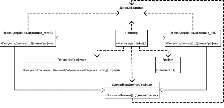 Точки входа находятся в компонентах Принтер_ММВБ и Принтер_РТС. На выходе эти компоненты будут давать exe-файлы, которые нам и требуются. Компонент График соответствует визуальному представлению графика биржевого индекса. Точки входа – это методы Main(args : string[]). Скорее всего, компонент Принтер_ММВБ и Принтер_РТС будут иметь общую логику, поэтому вводим компонент Принтер, наследниками которого они будут.