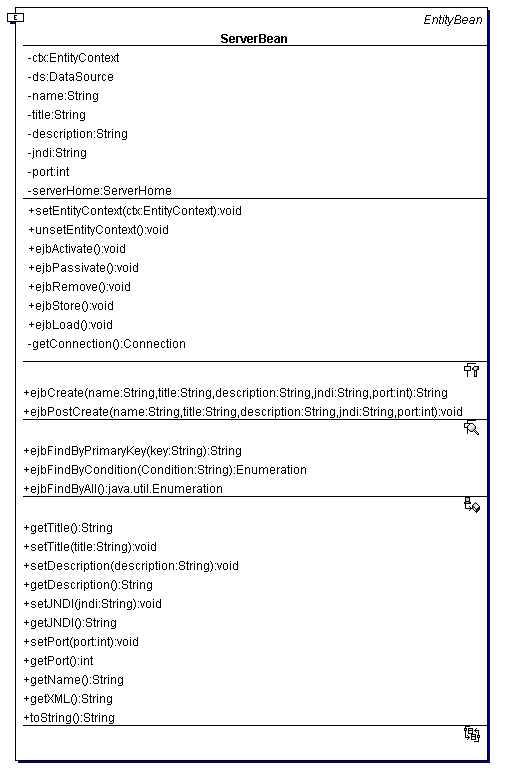 После того как Вы определили Home и Remote интерфейсы своего компонента, необходимо написать реализации методов определенных в них. К некоторым методам в реализации добавляется приставка ejb. Пример реализации выше рассмотренного компонента показан на рис. 10.