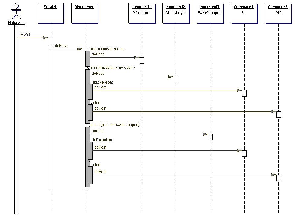 Как видно из рисунка, Servlet передает управление диспетчеру, а тот, в свою очередь, анализирует содержимое переменной action и вызывает соответствующий контроллер и, если после выполнения контроллера из action порождается исключение, то он вызывает контроллер определенный в rollback, а в случае успешного выполнения контроллера из action, диспетчер вызывает контроллер определенный в commit.