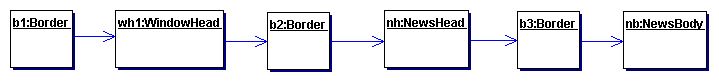Сначала объясню, что делает каждый декоратор. Border - просто рисует обрамление вокруг любого элемента. WindowHead - рисует подобие заголовка как у всех приложений Windows с кнопочками свернуть и закрыть. NewHead - рисует серенькое поле, а в нем пишет название новости. NewBody - рисует саму новость. Другими словами, заходите на web, а там новости оформлены в виде Windows окошек. Некоторые новостные сайты такое практикуют. А теперь вернемся к рис.8. Как видно b1 обрамляет wh1, wh1 содержит b2, b2 обрамляет nh, nh содержит b3, а b3 обрамляет nb. Как работает весь этот механизм изображено на рис.9.