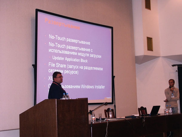 От RSDN было сразу два выступления. Доклад «Технологии создания клиентских приложений», подготовленный Иваном Бодягиным (Merle) и Андреем Корявченко (AndrewVK), рассказывал о вопросах создания и развертывания современных клиентских приложений. В частности, были раскрыты вопросы создания популярных сегодня Smart-клиентов и о технологии развертывания ClickOnce. Естественно, что все решения были основаны на Visual Studio 2005, .NET Framework 2.0, WinForms 2.0, Windows Presentation Foundation и готовых «строительных» блоках (Application Blocks): Smart Client Offline Application Block, CompositeUI Application Block, Updater Application Block.