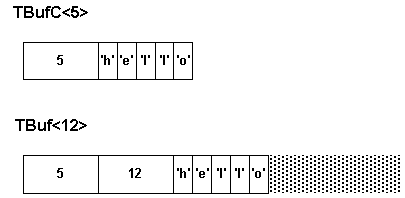 Это также два класса: TBufC и TBuf. Реализованы в виде шаблонов C++ и хранят строки внутри себя, не прибегая к динамическому выделению памяти.