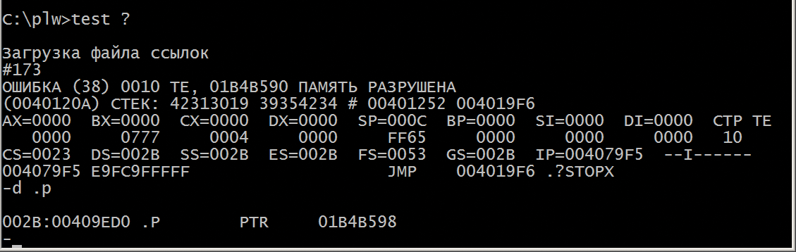 Во-первых, эффект неопределенной ошибки изменился на более конкретную причину «память разрушена», поскольку оператор A=0; затер нулями в «куче» начало следующего блока со ссылками и алгоритм ?TEST_MEM обнаружил это. Во-вторых, имеется подсказка в виде комментария к ошибке со значением 01B4B590. Это последний адрес в связанном списке «кучи», когда контроль целостности еще не находил ошибок. В режиме интерактивной отладки директивой «d .p» было запрошено значение указателя P. Оно оказалось на 8 байт больше начала блока, где обнаружено нарушение структуры. Это подсказка на возможную причину нарушения: до блока по адресу, хранящемуся в указателе P, в структуре «кучи» все еще было нормально. Поэтому можно предположить, что обращение именно к этому объекту и «разрушило память».