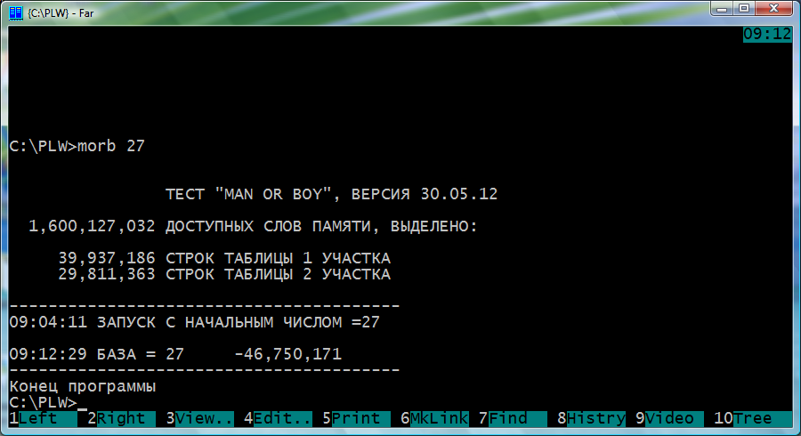 Результат приведен на рис. 2. Тест с начальным числом 27 выполнился менее, чем за 9 минут, получив значение -46750171 и построив для этого дерево глубиной 67 миллионов вложенных вызовов процедур А и В, а всего вызвав эти процедуры 292 миллиона раз. Поскольку компьютер имел лишь 1 Гбайт физической памяти, происходило обращение к диску, что существенно замедляло работу.