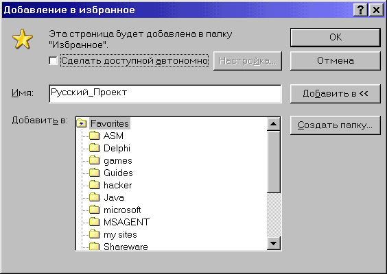 Dim suih As New ShellUIHelper Dim mysite As String mysite = "http://rsdn.ru/" suih.AddFavorite mysite, "RSDN" |
