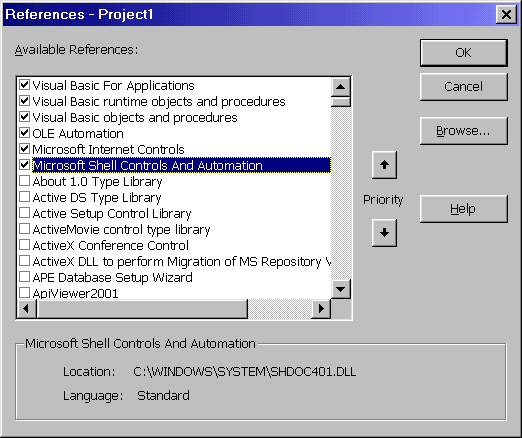 Получить доступ к объекту Shell в Visual Basic можно при помощи раннего связывания, добавив ссылку к библиотекам: